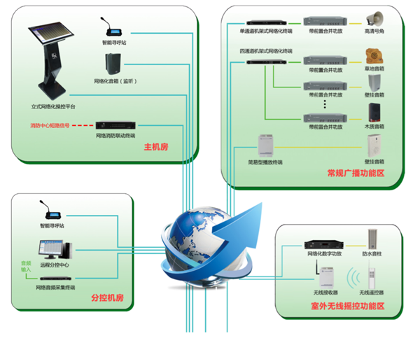 根據校方的需求,學校廣播採(cǎi)用點對點可尋址廣播系統,實現可對每一間教室 、每一間辦(bàn)公室以及操場等區域進行單獨廣播,組合廣播,老師或學生可在廣播控制室進行本地廣播或在辦(bàn)公室進行遠程廣播。