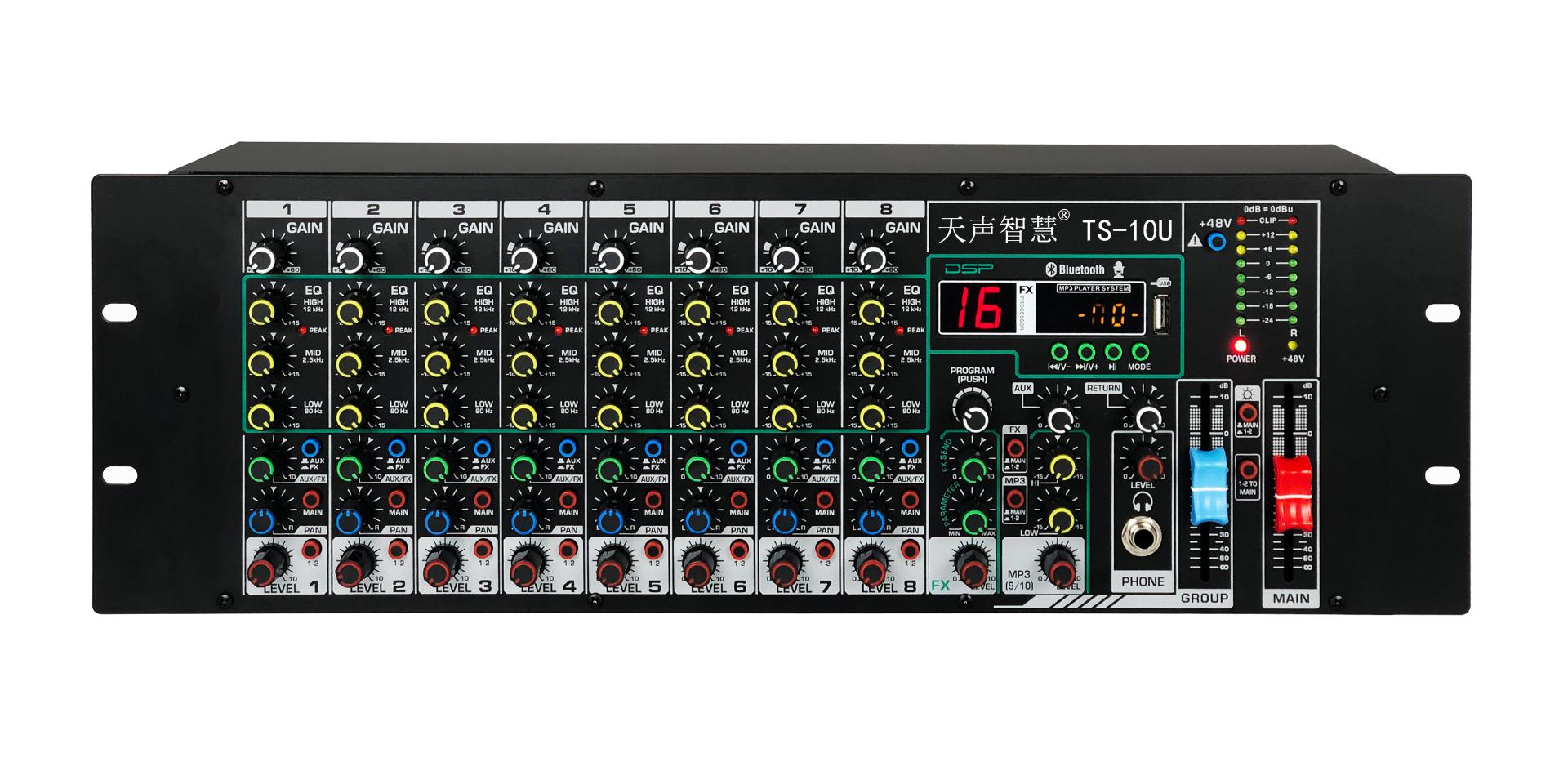 專業兩編組輸出調音台;10個輸入通道,8個話筒輸入,2立體聲線路輸入;1組輔助輸出,1個返回;标準的機架尺寸,可直接上機架安裝;通道三段均衡調(diào)節,高、中、低音單(dān)獨調(diào)節;内置24-Bit DSP數字果器;内置高品質MP3播放器,帶USB接口、錄音功能、藍(lán)牙連(lián)接功能 ; +48V幻象電源;高精度三色精確(què)電平柱,準確(què)顯示輸出電平;内置式靜噪開關電源器,全球通用;機身耐用輕巧。适用於(yú)中小型多功能廳、會議廳、宴會廳、學校、禮堂、酒店、公共廣播、固定安裝、錄音室等場所。