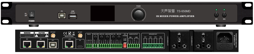 2路話筒輸入、採(cǎi)用平衡信号輸入(鳳凰端子),具有獨立音量調節 ,帶(dài)有48V幻像供電